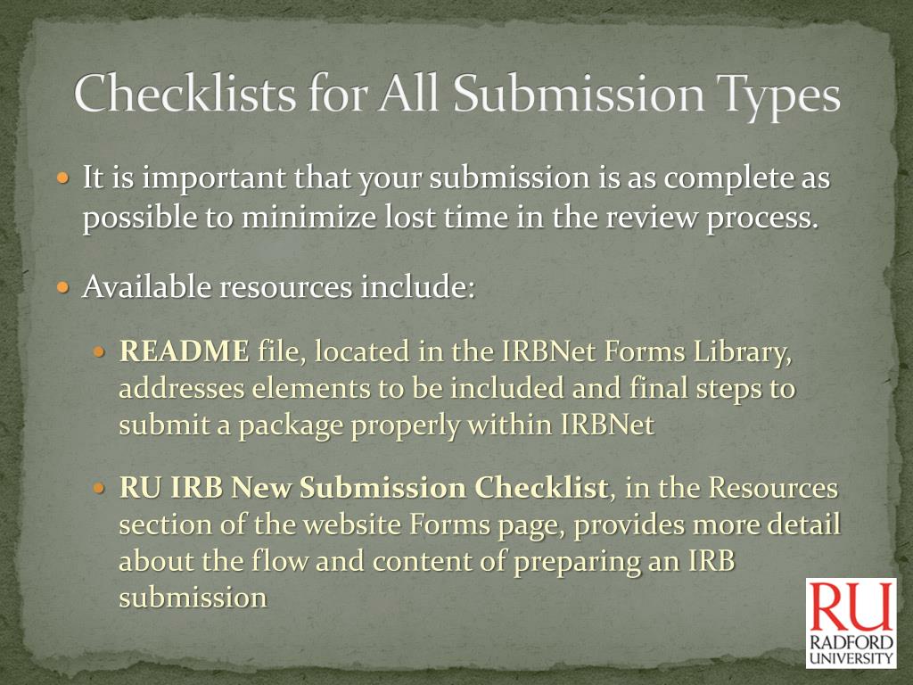 Checklists for All Submission Types • It is important that your submission is as complete as possible to minimize lost time in the review process. • Available resources include: • README file, located in the IRBNet Forms Library, addresses elements to be included and final steps to submit a package properly within IRBNet • RU IRB New Submission Checklist, in the Resources section of the website Forms page, provides more detail about the flow and content of preparing an IRB submission
