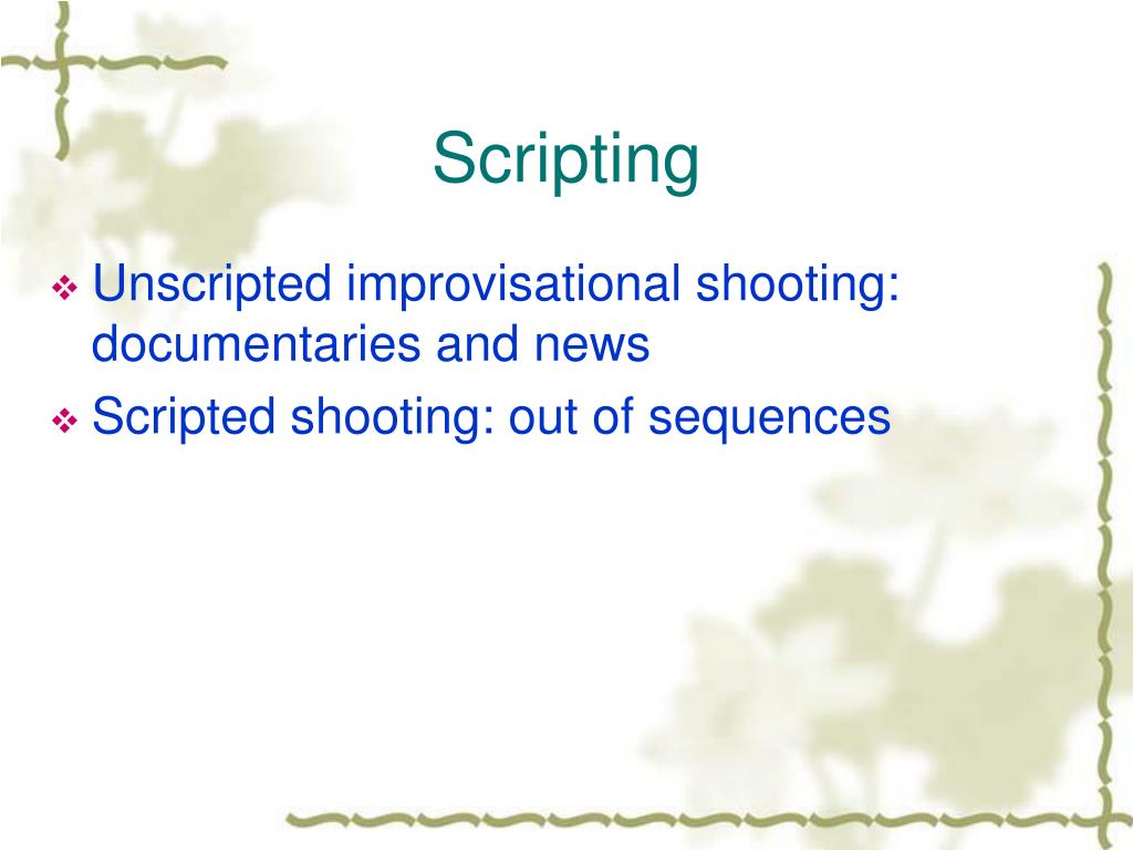 Scripting • Unscripted improvisational shooting: documentaries and news • Scripted shooting: out of sequences