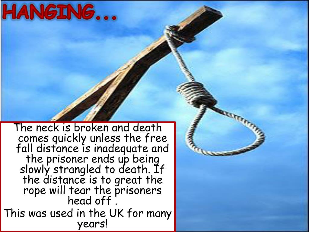 HANGING... The neck is broken and death comes quickly unless the free fall distance is inadequate and the prisoner ends up being slowly strangled to death. If the distance is to great the rope will tear the prisoners head off . This was used in the UK for many years!