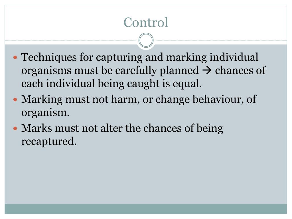 Control Techniques for capturing and marking individual organisms must be carefully planned chances of each individual being caught is equal. Marking must not harm, or change behaviour, of organism. Marks must not alter the chances of being recaptured.