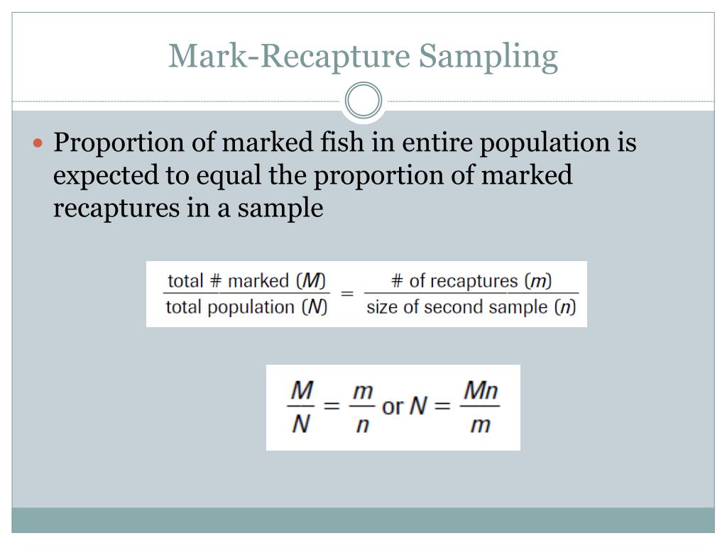 Mark-Recapture Sampling Proportion of marked fish in entire population is expected to equal the proportion of marked recaptures in a sample