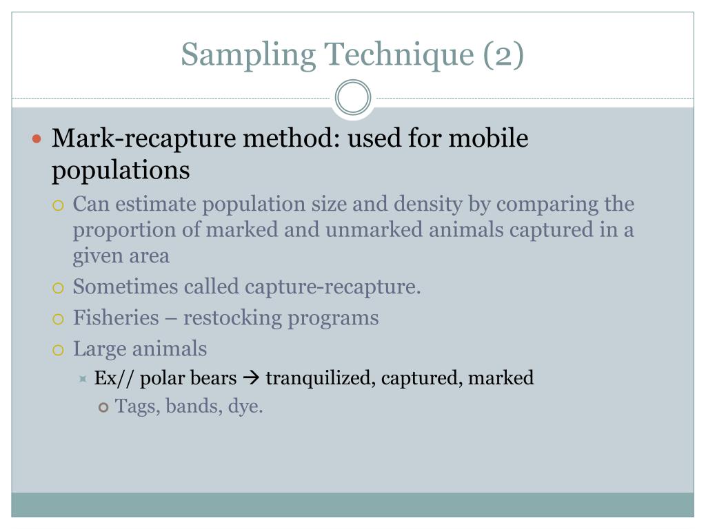 Sampling Technique (2) • Mark-recapture method: used for mobile populations • Can estimate population size and density by comparing the proportion of marked and unmarked animals captured in a given area • Sometimes called capture-recapture. • Fisheries – restocking programs • Large animals • Ex// polar bears tranquilized, captured, marked • Tags, bands, dye.