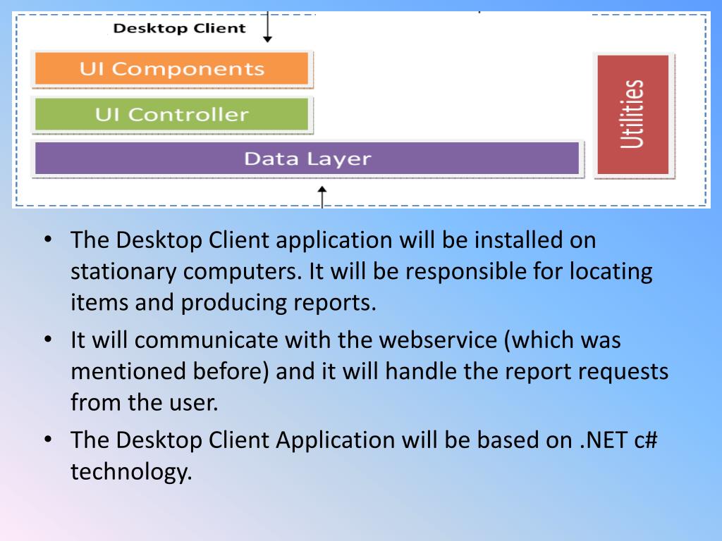 The Desktop Client application will be installed on stationary computers. It will be responsible for locating items and producing reports. • It will communicate with the webservice (which was mentioned before) and it will handle the report requests from the user. • The Desktop Client Application will be based on .NET c# technology.