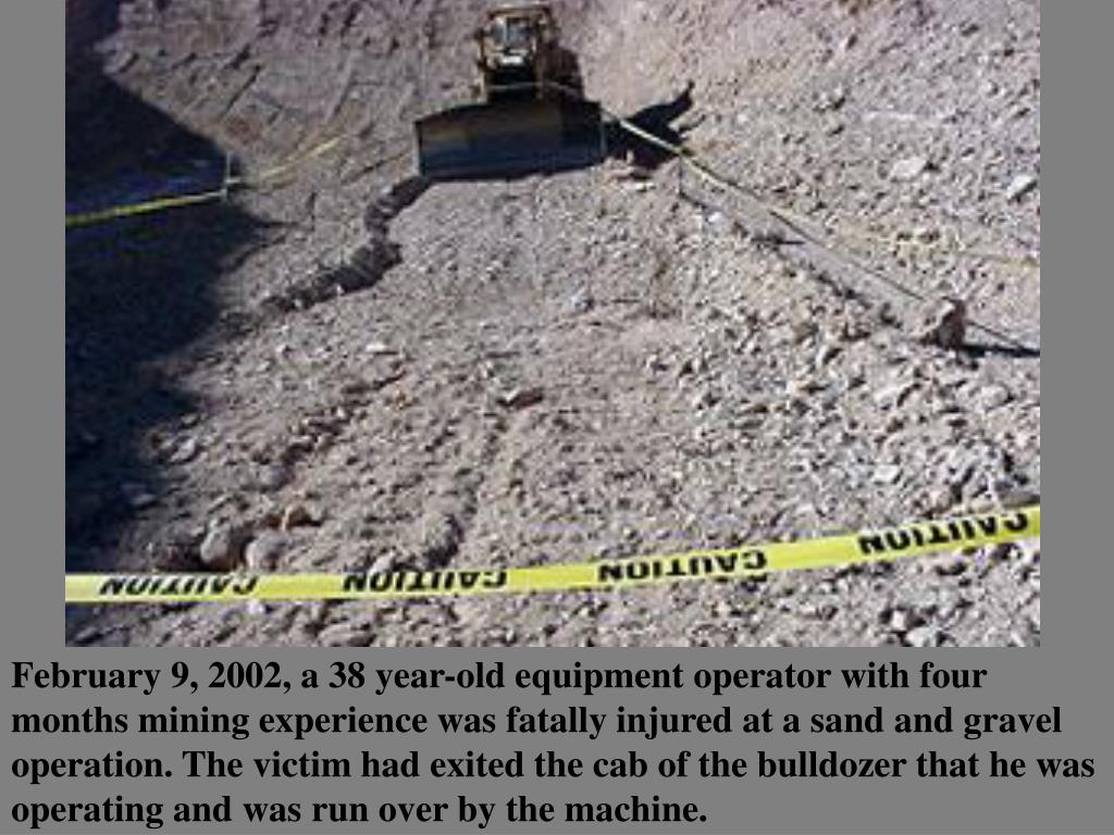 February 9, 2002, a 38 year-old equipment operator with four months mining experience was fatally injured at a sand and gravel operation. The victim had exited the cab of the bulldozer that he was operating and was run over by the machine.