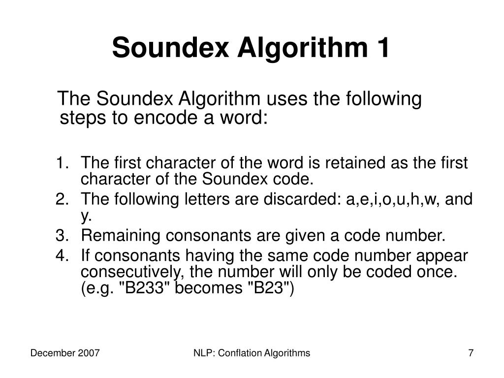 Soundex Algorithm 1 The Soundex Algorithm uses the following steps to encode a word: • The first character of the word is retained as the first character of the Soundex code. • The following letters are discarded: a,e,i,o,u,h,w, and y. • Remaining consonants are given a code number. • If consonants having the same code number appear consecutively, the number will only be coded once. (e.g. "B233" becomes "B23") NLP: Conflation Algorithms