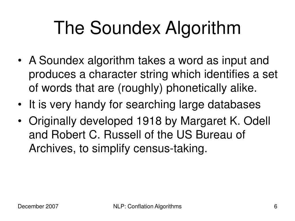 The Soundex Algorithm • A Soundex algorithm takes a word as input and produces a character string which identifies a set of words that are (roughly) phonetically alike. • It is very handy for searching large databases • Originally developed 1918 by Margaret K. Odell and Robert C. Russell of the US Bureau of Archives, to simplify census-taking. NLP: Conflation Algorithms