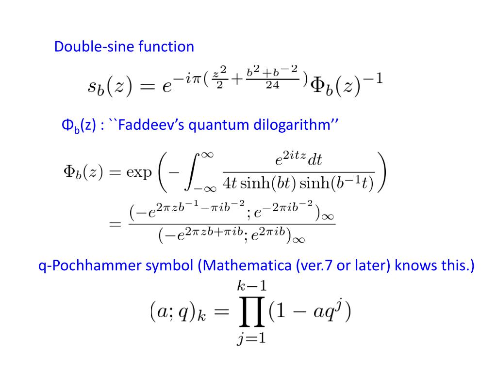 Double-sine function Φb(z) : ``Faddeev’s quantum dilogarithm’’ q-Pochhammer symbol (Mathematica(ver.7 or later) knows this.)