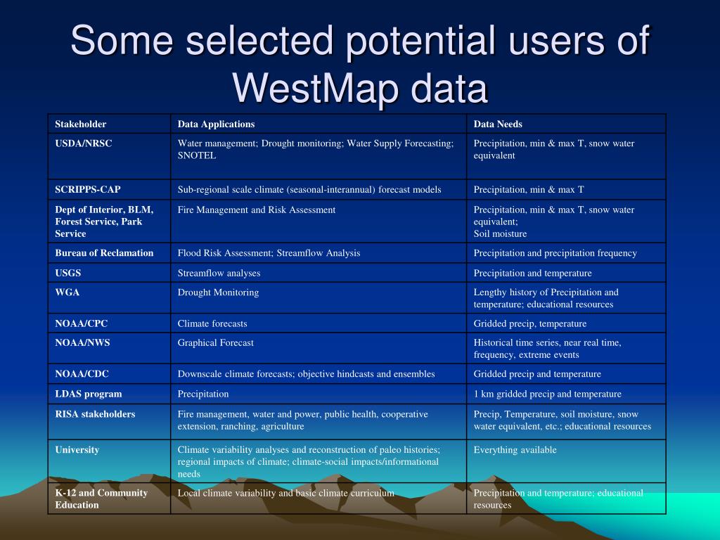 Product Applications • Five key areas • drought mitigation/monitoring, e.g.: • complement and enhance developing drought management initiatives and monitoring programs • in turn, these activities will help future mapping through identifying gaps/problems in the present data sets • climate variability • water management • global change modeling/assessment • forecasts (initial conditions) and downscaling of forecasts (limits of predictability, model verification) • WestMap impact will be very wide • Very large number of likely users: researchers, decision-makers, resource mgrs, etc. • integral climate mapping web interface for ease of access