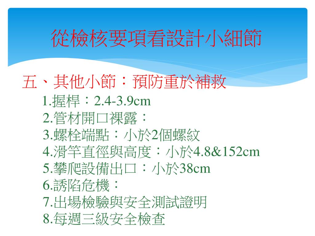 從檢核要項看設計小細節 五、其他小節:預防重於補救 1.握桿:2.4-3.9cm 2.管材開口裸露: 3.螺栓端點:小於2個螺紋 4.滑竿直徑與高度:小於4.8&152cm 5.攀爬設備出口:小於38cm 6.誘陷危機: 7.出場檢驗與安全測試證明 8.每週三級安全檢查