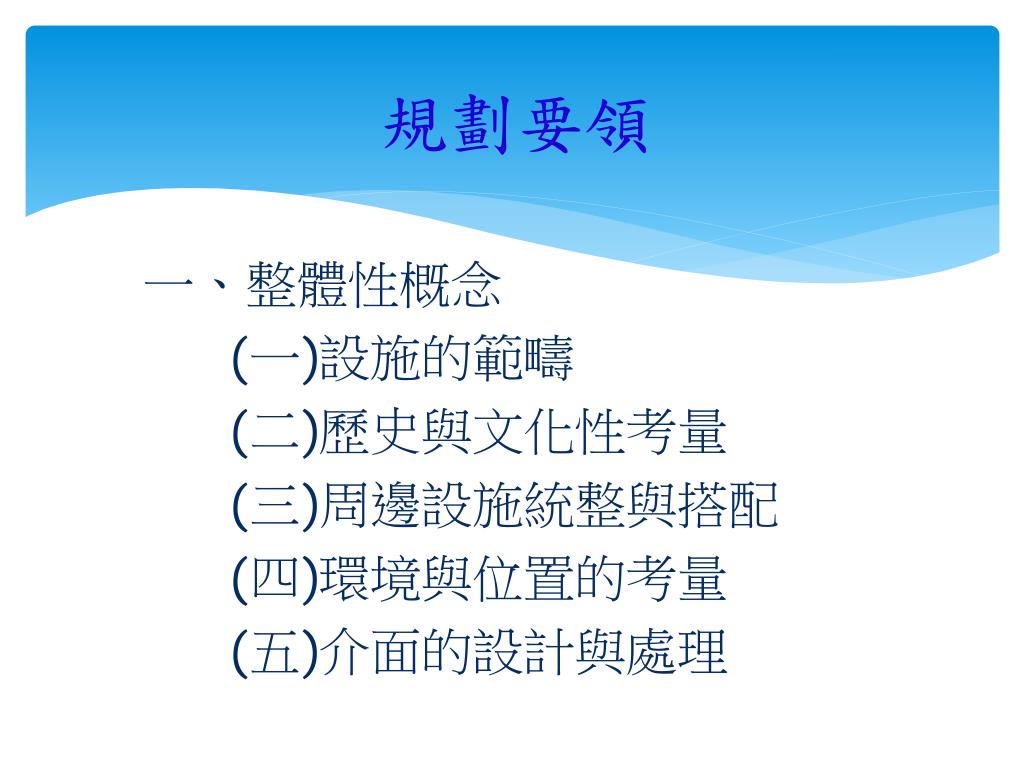 規劃要領 一、整體性概念 (一)設施的範疇 (二)歷史與文化性考量 (三)周邊設施統整與搭配 (四)環境與位置的考量 (五)介面的設計與處理