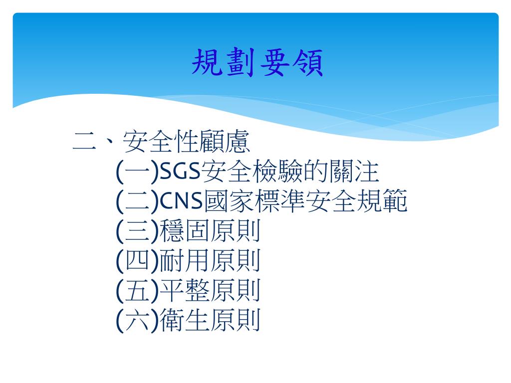 規劃要領 二、安全性顧慮 (一)SGS安全檢驗的關注 (二)CNS國家標準安全規範 (三)穩固原則 (四)耐用原則 (五)平整原則 (六)衛生原則
