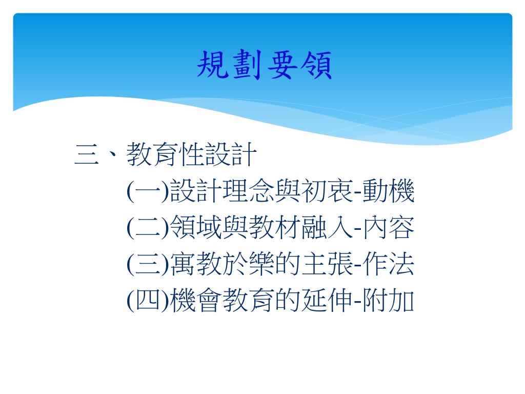 規劃要領 三、教育性設計 (一)設計理念與初衷-動機 (二)領域與教材融入-內容 (三)寓教於樂的主張-作法 (四)機會教育的延伸-附加