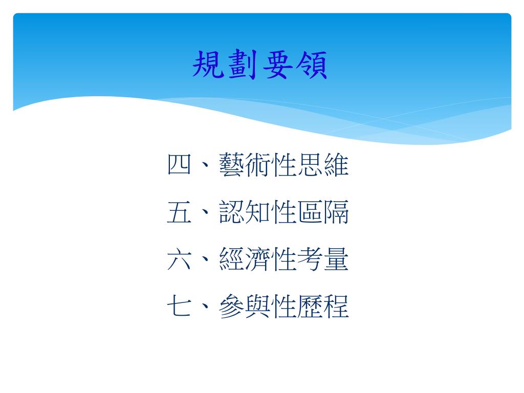 規劃要領 四、藝術性思維 五、認知性區隔 六、經濟性考量 七、參與性歷程