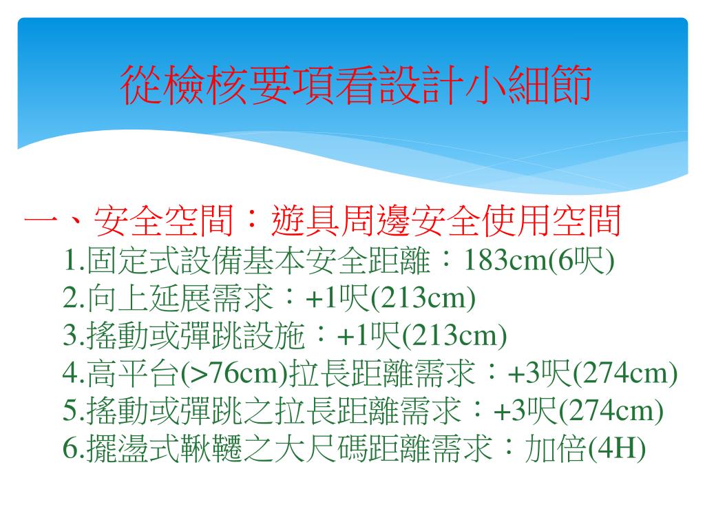 從檢核要項看設計小細節 一、安全空間:遊具周邊安全使用空間 1.固定式設備基本安全距離:183cm(6呎) 2.向上延展需求:+1呎(213cm) 3.搖動或彈跳設施:+1呎(213cm) 4.高平台(>76cm)拉長距離需求:+3呎(274cm) 5.搖動或彈跳之拉長距離需求:+3呎(274cm) 6.擺盪式鞦韆之大尺碼距離需求:加倍(4H)