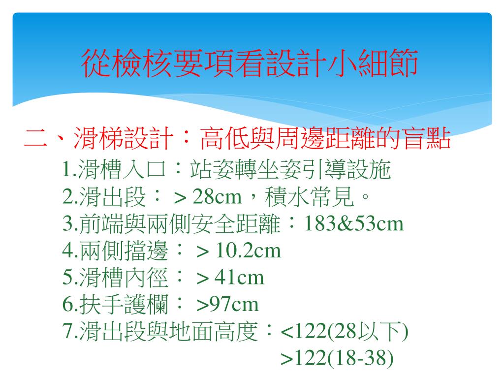 從檢核要項看設計小細節 二、滑梯設計:高低與周邊距離的盲點 1.滑槽入口:站姿轉坐姿引導設施 2.滑出段: > 28cm,積水常見。 3.前端與兩側安全距離:183&53cm 4.兩側擋邊: > 10.2cm 5.滑槽內徑: > 41cm 6.扶手護欄: >97cm 7.滑出段與地面高度:<122(28以下) >122(18-38)