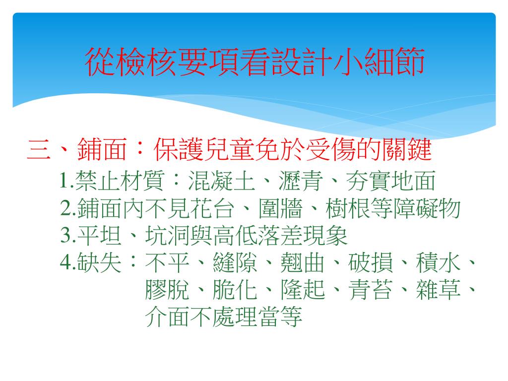 從檢核要項看設計小細節 三、鋪面:保護兒童免於受傷的關鍵 1.禁止材質:混凝土、瀝青、夯實地面 2.鋪面內不見花台、圍牆、樹根等障礙物 3.平坦、坑洞與高低落差現象 4.缺失:不平、縫隙、翹曲、破損、積水、 膠脫、脆化、隆起、青苔、雜草、 介面不處理當等