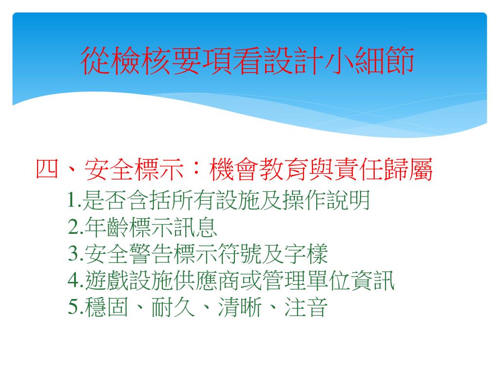 從檢核要項看設計小細節 四、安全標示:機會教育與責任歸屬 1.是否含括所有設施及操作說明 2.年齡標示訊息 3.安全警告標示符號及字樣 4.遊戲設施供應商或管理單位資訊 5.穩固、耐久、清晰、注音