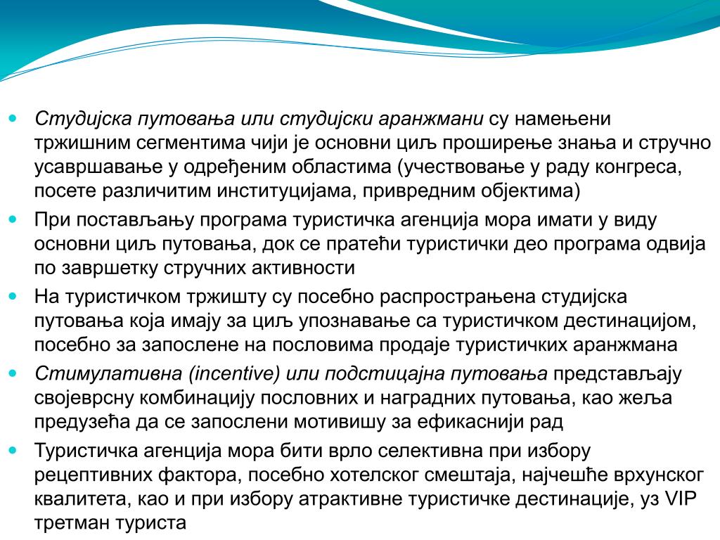 Студијска путовања или студијски аранжмани су намењени тржишним сегментима чији је основни циљ проширење знања и стручно усавршавање у одређеним областима (учествовање у раду конгреса, посете различитим институцијама, привредним објектима) • При постављању програма туристичка агенција мора имати у виду основни циљ путовања, док се пратећи туристички део програма одвија по завршетку стручних активности • На туристичком тржишту су посебно распрострањена студијска путовања која имају за циљ упознавање са туристичком дестинацијом, посебно за запослене на пословима продаје туристичких аранжмана • Стимулативна (incentive) или подстицајна путовања представљају својеврсну комбинацију пословних и наградних путовања, као жеља предузећа да се запослени мотивишу за ефикаснији рад • Туристичка агенција мора бити врло селективна при избору рецептивних фактора, посебно хотелског смештаја, најчешће врхунског квалитета, као и при избору атрактивне туристичке дестинације, уз VIP третман туриста