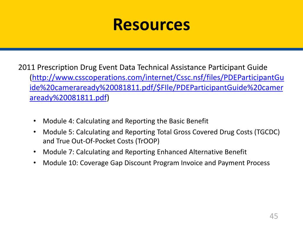 Resources 2011 Prescription Drug Event Data Technical Assistance Participant Guide (http://www.csscoperations.com/internet/Cssc.nsf/files/PDEParticipantGuide%20cameraready%20081811.pdf/$FIle/PDEParticipantGuide%20cameraready%20081811.pdf) • Module 4: Calculating and Reporting the Basic Benefit • Module 5: Calculating and Reporting Total Gross Covered Drug Costs (TGCDC) and True Out-Of-Pocket Costs (TrOOP) • Module 7: Calculating and Reporting Enhanced Alternative Benefit • Module 10: Coverage Gap Discount Program Invoice and Payment Process 45