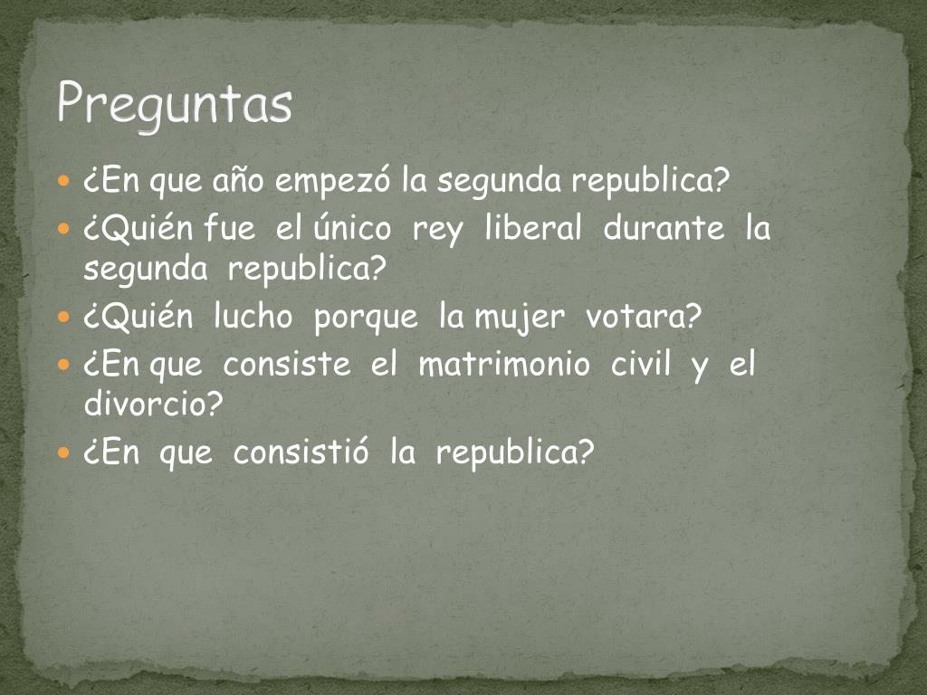 Preguntas • ¿En que año empezó la segunda republica? • ¿Quién fue el único rey liberal durante la segunda republica? • ¿Quién lucho porque la mujer votara? • ¿En que consiste el matrimonio civil y el divorcio? • ¿En que consistió la republica?