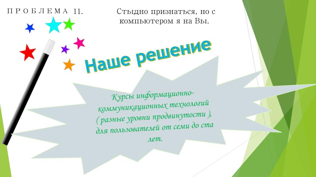 ПРОБЛЕМА 11. Стыдно признаться, но с компьютером я на Вы. Наше решение Курсы информационно-коммуникационных технологий ( разные уровни продвинутости ), для пользователей от семи до ста лет.