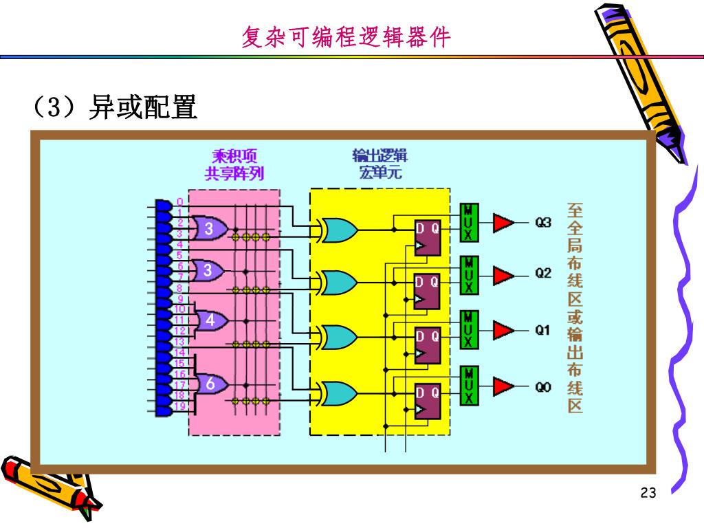 3 3 4 6 复杂可编程逻辑器件 (3)异或配置 4个或门输入按3、3、4、6配置,其输出通过共享阵列产生4个输出,分别接到OLMC中异或门的1个输入端,而乘积项0、4、8、13不再作为各或门第一乘积项的输入,而是直接输出到各自的OLMC中,作为异或门的另一个输入,形成异或配置。