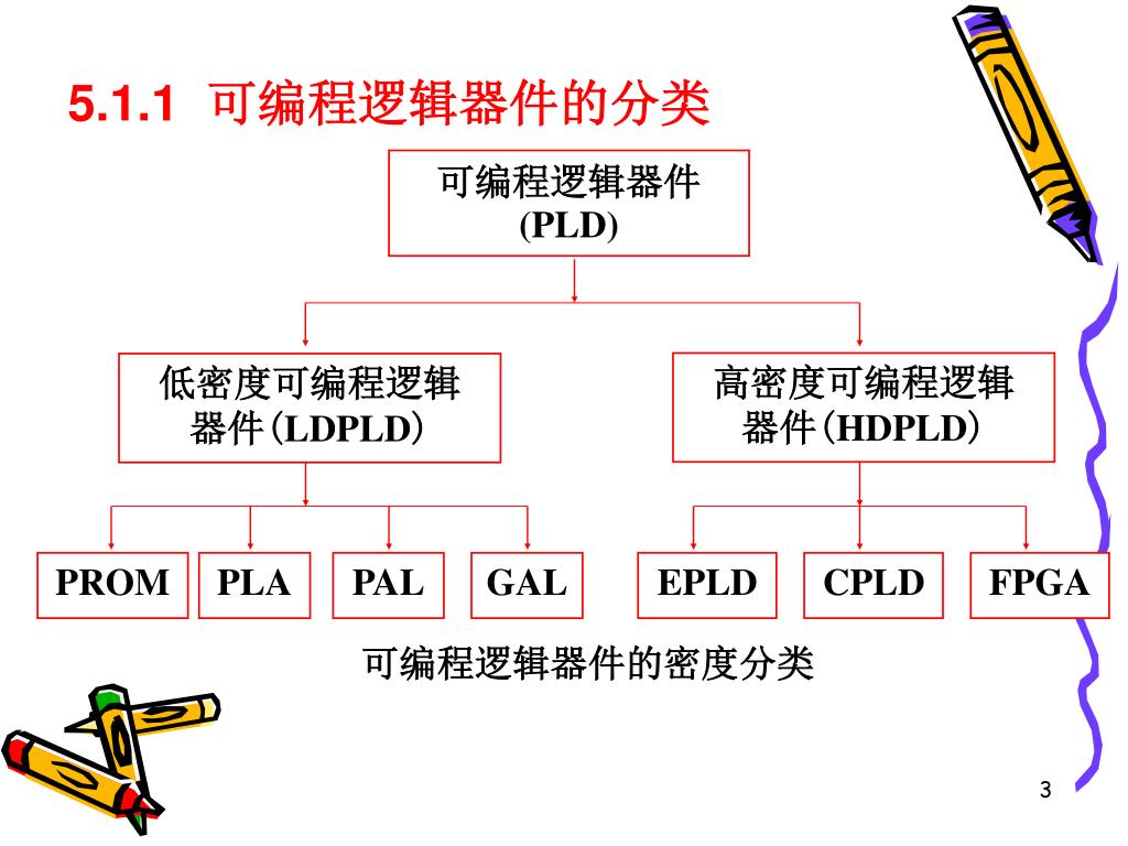 1.按集成密度分类 可编程逻辑器件从集成密度上可分为低密度可编程逻辑器件LDPLD和高密度可编程逻辑器件HDPLD两类。 LDPLD 通常是指早期发展起来的、集成密度小于700门/片左右的PLD如ROM、PLA、PAL和GAL等。 HDPLD包括可擦除可编程逻辑器件EPLD(Erasable Programmable Logic Device)、复杂可编程逻辑器件CPLD(Complex PLD)和FPGA三种,其集成密度大于700门/片。如Altera公司的EPM9560,其密度为12000门/片,Lattice公司的pLSI/ispLSI3320为14000门/片等。目前集成度最高的HDPLD可达25万门/片以上。