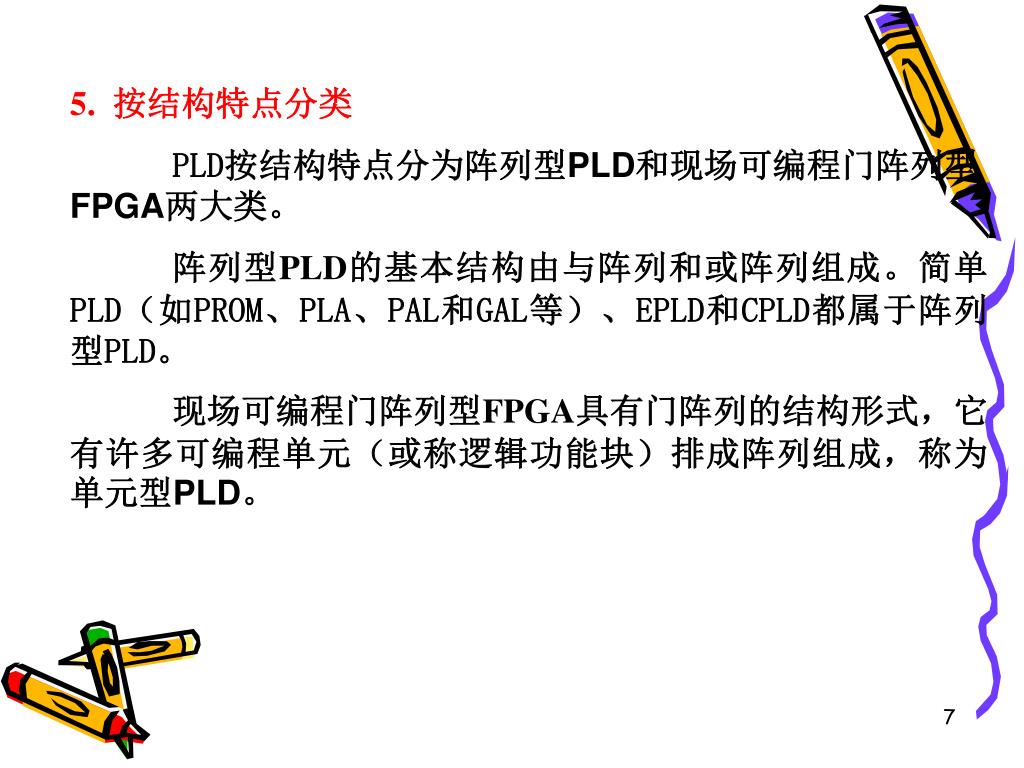 5. 按结构特点分类 PLD按结构特点分为阵列型PLD和现场可编程门阵列型FPGA两大类。 阵列型PLD的基本结构由与阵列和或阵列组成。简单PLD(如PROM、PLA、PAL和GAL等)、EPLD和CPLD都属于阵列型PLD。 现场可编程门阵列型FPGA具有门阵列的结构形式,它有许多可编程单元(或称逻辑功能块)排成阵列组成,称为单元型PLD。