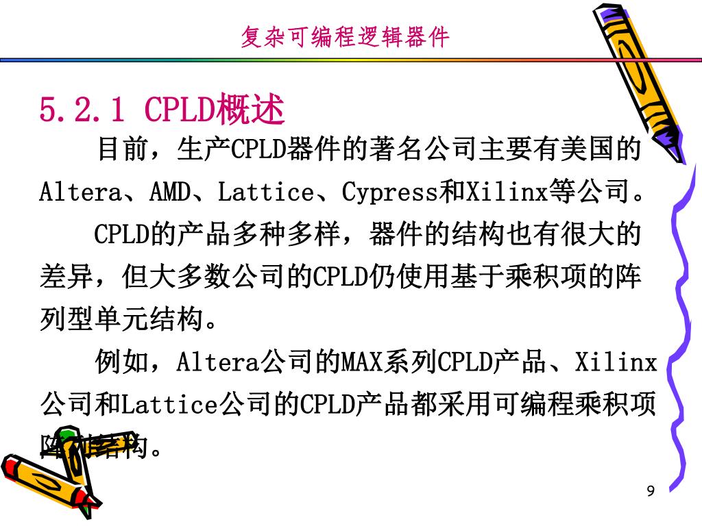 复杂可编程逻辑器件 5.2.1 CPLD概述 目前,生产CPLD器件的著名公司主要有美国的Altera、AMD、Lattice、Cypress和Xilinx等公司。 CPLD的产品多种多样,器件的结构也有很大的差异,但大多数公司的CPLD仍使用基于乘积项的阵列型单元结构。 例如,Altera公司的MAX系列CPLD产品、Xilinx公司和Lattice公司的CPLD产品都采用可编程乘积项阵列结构。