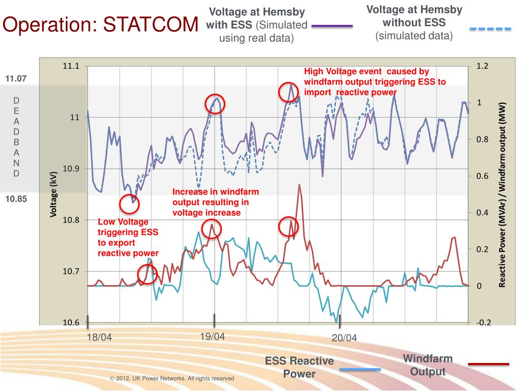 Voltage at Hemsby without ESS (simulated data) Voltage at Hemsby with ESS (Simulated using real data) Operation: STATCOM High Voltage event caused by windfarm output triggering ESS to import reactive power 11.07 D E A D B A N D Increase in windfarm output resulting in voltage increase 10.85 Low Voltage triggering ESS to export reactive power 19/04 18/04 20/04 Windfarm Output ESS Reactive Power