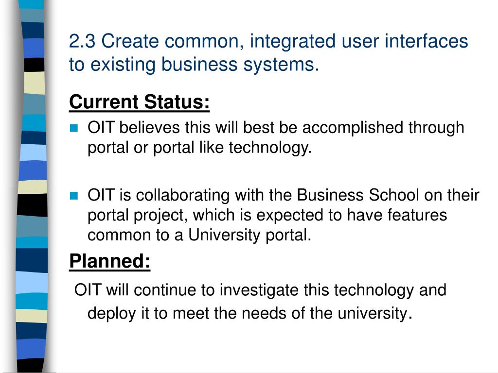 2.3 Create common, integrated user interfaces to existing business systems. Current Status: • OIT believes this will best be accomplished through portal or portal like technology. • OIT is collaborating with the Business School on their portal project, which is expected to have features common to a University portal. Planned: OIT will continue to investigate this technology and deploy it to meet the needs of the university.