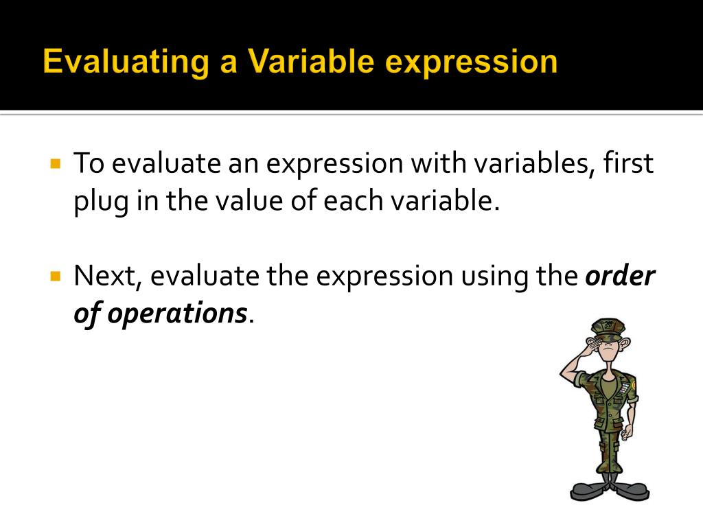 Evaluating a Variable expression • To evaluate an expression with variables, first plug in the value of each variable. • Next, evaluate the expression using the order of operations.