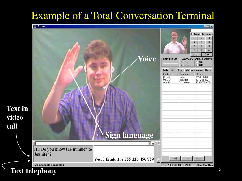 Example of a Total Conversation Terminal Voice Text in video call Sign language Text telephony