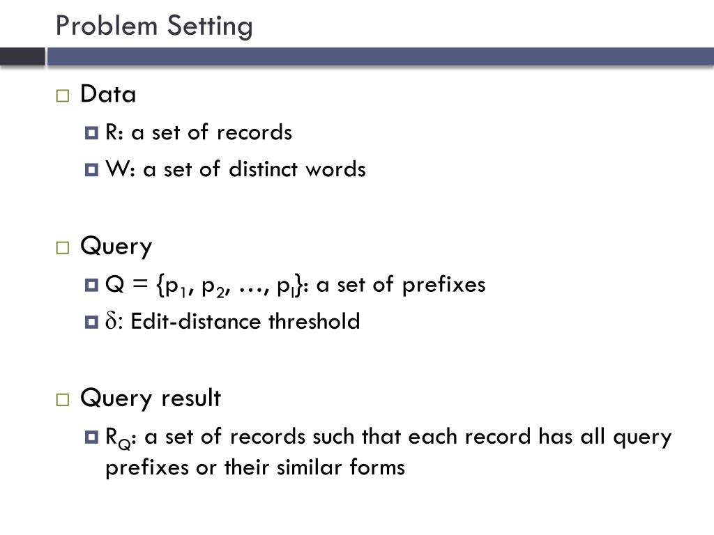 Problem Setting • Data • R: a set of records • W: a set of distinct words • Query • Q = {p1, p2, …, pl}: a set of prefixes • δ:Edit-distance threshold • Query result • RQ: a set of records such that each record has all query prefixes or their similar forms