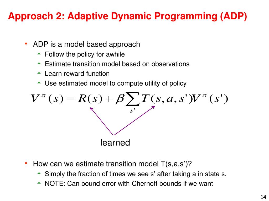 Approach 2: Adaptive Dynamic Programming (ADP) • ADP is a model based approach • Follow the policy for awhile • Estimate transition model based on observations • Learn reward function • Use estimated model to compute utility of policy • How can we estimate transition model T(s,a,s’)? • Simply the fraction of times we see s’ after taking a in state s. • NOTE: Can bound error with Chernoff bounds if we want learned