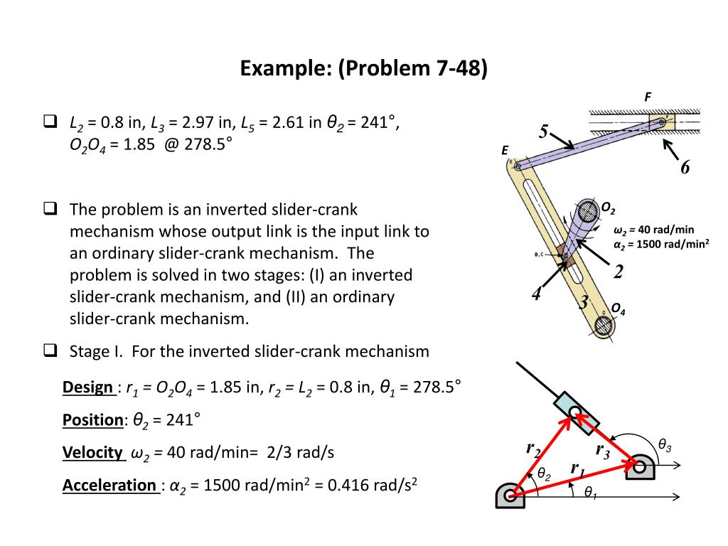 Example: (Problem 7-48) F • L2 = 0.8 in, L3= 2.97 in, L5 = 2.61 inθ2 = 241°, O2O4 = 1.85 @ 278.5° • The problem is an inverted slider-crank mechanism whose output link is the input link to an ordinary slider-crank mechanism. The problem is solved in two stages: (I) an inverted slider-crank mechanism, and (II) an ordinary slider-crank mechanism. • Stage I. For the inverted slider-crank mechanism 5 E 6 O2 ω2 = 40 rad/min α2 = 1500 rad/min2 2 4 3 Design : r1 = O2O4 = 1.85 in, r2 = L2 = 0.8 in, θ1= 278.5° Position: θ2 = 241° Velocity ω2= 40 rad/min= 2/3 rad/s Acceleration : α2 = 1500 rad/min2 = 0.416 rad/s2 O4 θ3 r2 r3 r1 θ2 θ1