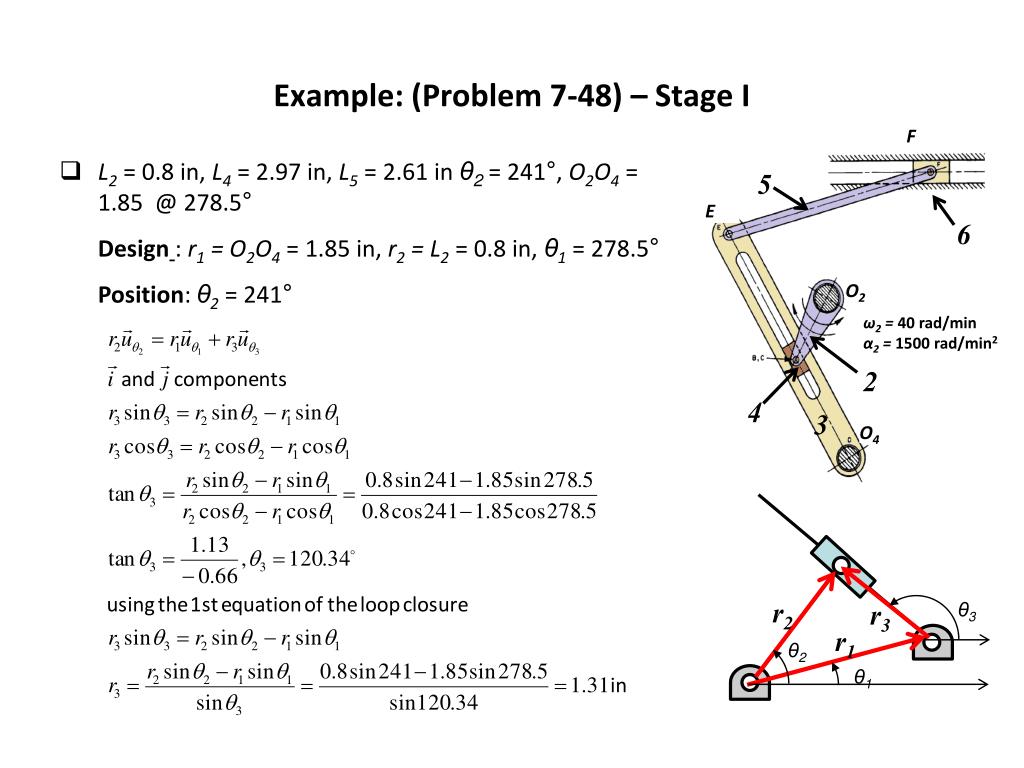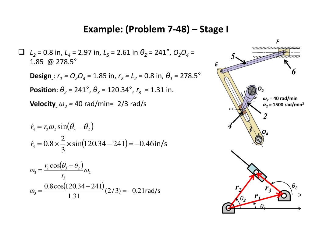 Example: (Problem 7-48) – Stage I F • L2 = 0.8 in, L4 = 2.97 in, L5 = 2.61 inθ2 = 241°, O2O4 = 1.85 @ 278.5° • Design: r1 = O2O4 = 1.85 in, r2 = L2 = 0.8 in, θ1= 278.5° • Position: θ2 = 241° 5 E 6 O2 ω2 = 40 rad/min α2 = 1500 rad/min2 2 4 3 O4 θ3 r2 r3 r1 θ2 θ1