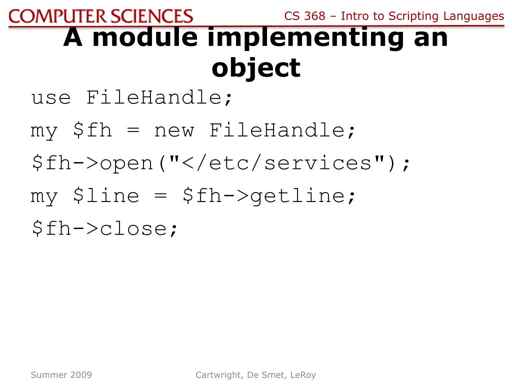 A module implementing an object use FileHandle; my $fh = new FileHandle; $fh->open("</etc/services"); my $line = $fh->getline; $fh->close; Cartwright, De Smet, LeRoy