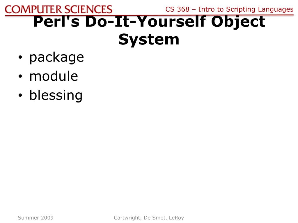 Perl's Do-It-Yourself Object System • package • module • blessing Cartwright, De Smet, LeRoy