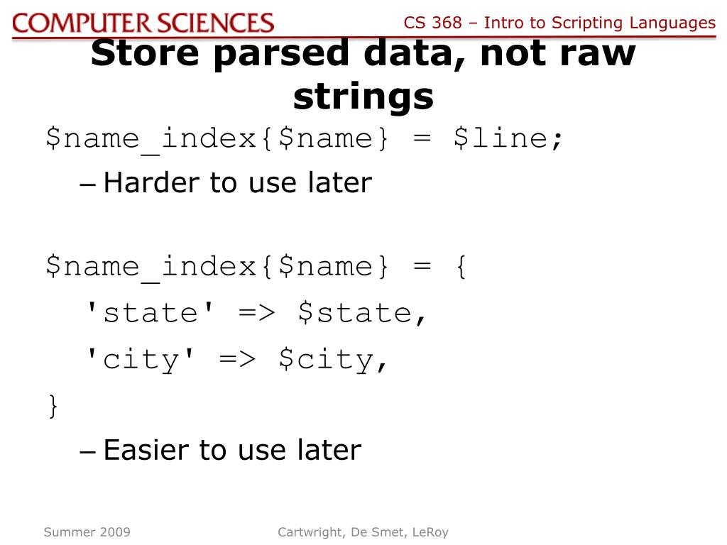 Store parsed data, not raw strings $name_index{$name} = $line; • Harder to use later $name_index{$name} = { 'state' => $state, 'city' => $city, } • Easier to use later Cartwright, De Smet, LeRoy