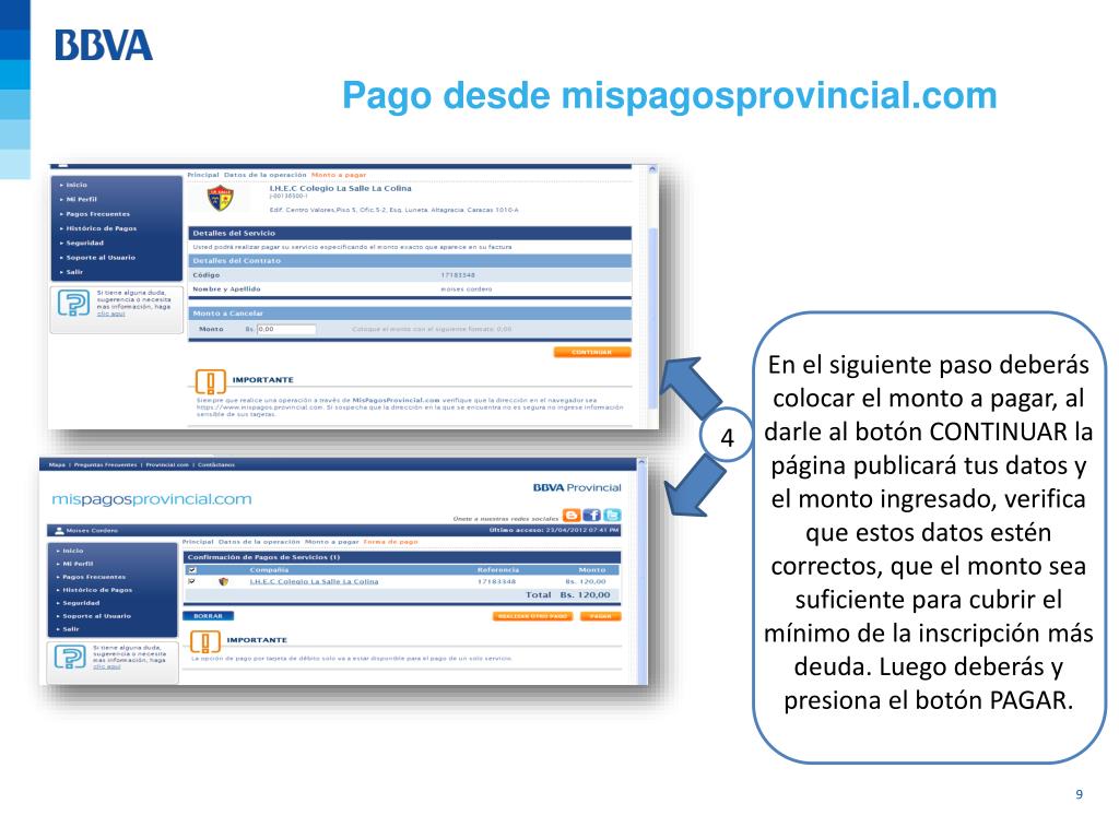 Pago desde mispagosprovincial.com En el siguiente paso deberás colocar el monto a pagar, al darle al botón CONTINUAR la página publicará tus datos y el monto ingresado, verifica que estos datos estén correctos, que el monto sea suficiente para cubrir el mínimo de la inscripción más deuda. Luego deberás y presiona el botón PAGAR. 4
