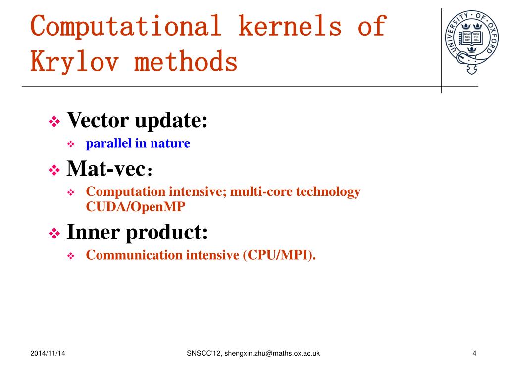 Computational kernels of Krylov methods Vector update: parallel in nature Mat-vec: Computation intensive; multi-core technology CUDA/OpenMP Inner product: Communication intensive (CPU/MPI). SNSCC'12, shengxin.zhu@maths.ox.ac.uk
