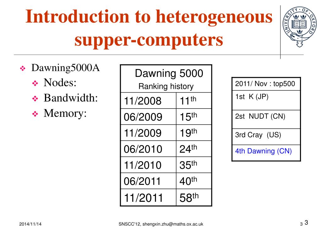 Introduction to heterogeneous supper-computers 3 • Dawning5000A • Nodes: • Bandwidth: • Memory: SNSCC'12, shengxin.zhu@maths.ox.ac.uk
