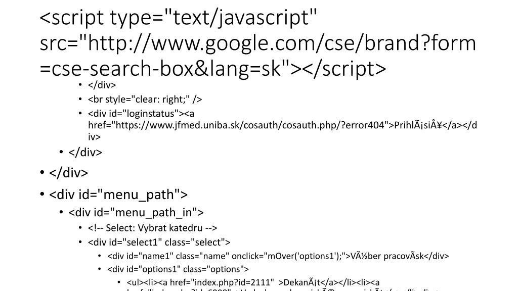 <script type="text/javascript" src="http://www.google.com/cse/brand?form=cse-search-box&lang=sk"></script> • </div> • <br style="clear: right;" /> • <div id="loginstatus"><a href="https://www.jfmed.uniba.sk/cosauth/cosauth.php/?error404">PrihlásiÅ¥</a></div> • </div> • </div> • <div id="menu_path"> • <div id="menu_path_in"> • <!-- Select: Vybrat katedru --> • <div id="select1" class="select"> • <div id="name1" class="name" onclick="mOver('options1');">Výber pracovÃsk</div> • <div id="options1" class="options"> • <ul><li><a href="index.php?id=2111" >Dekanát</a></li><li><a href="index.php?id=6998" >Vedecko-pedagogické pracoviská</a></li><li><a href="index.php?id=2050" >ÚÄelové pracoviská</a></li><li><a href="index.php?id=6795" >Výskumné pracoviská</a></li> </ul> • </div> • </div> • <!-- Select: Informácie pre... --> • <div id="select2" class="select"> • <div id="name2" class="name" onclick="mOver('options2');">Vybrané informácie pre ...</div> • <div id="options2" class="options"> • <ul><li><a href="index.php?id=6437&no_cache=1" >UchádzaÄ o Å¡túdium</a></li><li><a href="index.php?id=58&no_cache=1" >Å tudent</a></li><li><a href="index.php?id=57&no_cache=1" >Absolvent</a></li><li><a href="index.php?id=56&no_cache=1" >Zamestnanec</a></li> </ul> • </div> • </div> • </div> • </div> • <div id="content"> • <div id="content_in"> • <br style="line-height: 1px; clear: both; float: none;" /> • <ul id="content_title_menu"> • <li><a href="index.php?id=110" accesskey="2" >Aktuálne:</a><ul><li><a href="index.php?id=3076&no_cache=1" >Kalendár podujatÃ</a>, </li><li><a href="index.php?id=111" >Novinky</a></li></ul><div class="space"></div></li><li><a href="index.php?id=109" >Fakulta:</a><ul><li><a href="index.php?id=118" >OrganizaÄná Å¡truktúra</a>, </li><li><a href="index.php?id=117" >SúÄasti fakulty</a>, </li><li><a href="index.php?id=6128" >Etická komisia</a>, </li><li><a href="index.php?id=115" >LegislatÃva</a>, </li><li><a href="index.php?id=2407" >Kontakty</a></li></ul><div class="space"></div></li><li><a href="index.php?id=108" >Vzdelávanie:</a><ul><li><a href="index.php?id=120" >Organizácia Å¡túdia na JLF UK</a>, </li><li><a href="index.php?id=4980" >Doktorandské Å¡túdium</a>, </li><li><a href="index.php?id=1672" >Celoživotné vzdelávanie</a></li></ul><div class="space"></div></li><li><a href="index.php?id=107" >Veda a výskum:</a><ul><li><a href="index.php?id=6387" >Pracoviská podporujúce vedu</a>, </li><li><a href="index.php?id=6389" >Excelentné pracoviská</a>, </li><li><a href="index.php?id=127" >Projekty</a>, </li><li><a href="index.php?id=5321" >HabilitaÄné a vymenúvacie konania</a>, </li><li><a href="index.php?id=6390" >Rozvoj</a></li></ul><div class="space"></div></li><li><a href="index.php?id=105" >ZahraniÄné vzÅ¥ahy:</a><ul><li><a href="index.php?id=1706" >Bilaterálne vzÅ¥ahy</a>, </li><li><a href="index.php?id=135" >Erasmus</a>, </li><li><a href="index.php?id=134" >ZahraniÄná spolupráca</a>, </li><li><a href="index.php?id=6281" >Å tipendiá a granty</a></li></ul><div class="space"></div></li><li><a href="index.php?id=4105&no_cache=1" >Odborné stránky:</a><ul><li><a href="index.php?id=6039" >Lekárske fakulty v SR a ÄŒR</a>, </li><li><a href="index.php?id=6079" >Univerzitné Äasopisy</a>, </li><li><a href="index.php?id=4109&no_cache=1" >Podpora Å¡túdia medicÃny</a>, </li><li><a href="index.php?id=6043" >Portál MEFANET</a>, </li><li><a href="index.php?id=6046" >ECDC</a></li></ul><div class="space"></div></li><li><a href="index.php?id=106" >Odkazy:</a><ul><li><a href="index.php?id=4729" >Internet</a>, </li><li><a href="index.php?id=2161" >Akademická knižnica</a>, </li><li><a href="index.php?id=4687" >Univerzitná nemocnica</a>, </li><li><a href="index.php?id=2443" >Webmail</a>, </li><li><a href="index.php?id=2166" >IT služby</a>, </li><li><a href="index.php?id=3520&no_cache=1" >Formuláre</a>, </li><li><a href="index.php?id=6042" >Attachmenty</a>, </li><li><a href="index.php?id=2621" >Webkamera</a></li></ul><div class="space"></div></li><li><a href="index.php?id=3099" >Konferencie:</a> • </ul> • </div> • </div> • <div id="news_out"><div id="news"><div id="news_in"> • <div id="news_menu"> • <ul id="news_list"> • <li><a href="index.php?id=4348" >Akademický systém AIS-2</a></li><li><a href="index.php?id=5306" >Nahlasovanie porúch IT</a></li><li><a href="index.php?id=5126" >Publikovanie na Mefanete</a></li><li><a href="index.php?id=151" >Fotografie z podujatÃ</a></li><li><a href="index.php?id=1574" >Vyhľadávanie osôb</a></li><li><a href="index.php?id=3813&no_cache=1" >Videokonferencie</a></li><li><a href="index.php?id=3519" >Stravovacà systém</a></li> • </ul> • </div> • <div id="news_2"> • <div id="news_left"> • <h2><a href="index.php?id=18&no_cache=1" onfocus="blurLink(this);" >Novinky a oznamy</a></h2> <!-- CONTENT ELEMENT, uid:45/list [begin] --> <a id="c45"></a> <!-- Plugin inserted: [begin] --> • <ul> • <li> • <a href="index.php?id=186&tx_ttnews[tt_news]=1895&tx_ttnews[backPid]=18&cHash=9d4fa786ab" title="Nové Å¡pecializaÄné Å¡tudijné programy: MAMOLÓGIA, ONKOLÓGIA V UROLÓGII">Nové Å¡pecializaÄné Å¡tudijné programy: MAMOLÓGIA, ONKOLÓGIA V UROLÓGII</a> • </li> • <li> • <a href="index.php?id=186&tx_ttnews[tt_news]=1894&tx_ttnews[backPid]=18&cHash=df340fad54" title="REZIDENTSKà PROGRAM - AKTUÃLNE!">REZIDENTSKà PROGRAM - AKTUÃLNE!</a> • </li> • <li> • <a href="index.php?id=186&tx_ttnews[tt_news]=1892&tx_ttnews[backPid]=18&cHash=9a07517dc2" title="Oznámenie o obhajobe dizertaÄnej práce v Å¡tudijnom odbore 7.1.21. patologická anatómia a súdne lekárstvo">Oznámenie o obhajobe dizertaÄnej práce v Å¡tudijnom odbore 7.1.21. patologická anatómia a súdne lekárstvo</a> • </li> • <li> • <a href="fileadmin/user_upload/editors/Veda_Files/Racay_vymenuvacie_konanie_oznam.jpg" tit