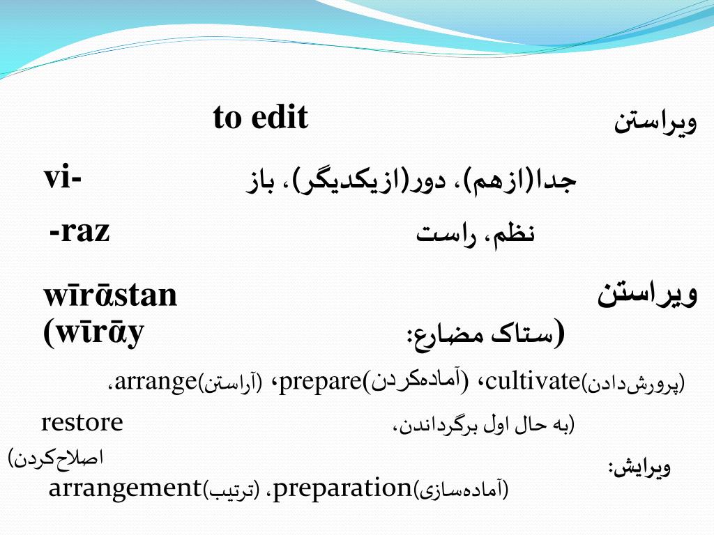 to editویراستن vi-جدا(از هم)، دور(از یکدیگر)، باز -razنظم، راست wīrᾱstanویراستن )wῑrᾱy (ستاک مضارع: ، arrange(آراستن)،prepare، (آمادهکردن)cultivate(پرورشدادن) restore (به حال اول برگرداندن، اصلاحکردن) ویرایش: arrangement، (ترتیب)preparation(آمادهسازی)