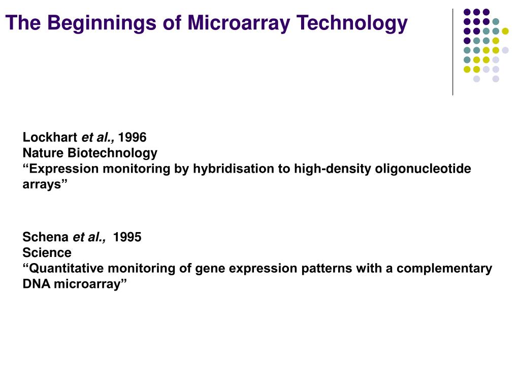 The Beginnings of Microarray Technology Lockhart et al., 1996 Nature Biotechnology “Expression monitoring by hybridisation to high-density oligonucleotide arrays” Schena et al., 1995 Science “Quantitative monitoring of gene expression patterns with a complementary DNA microarray”