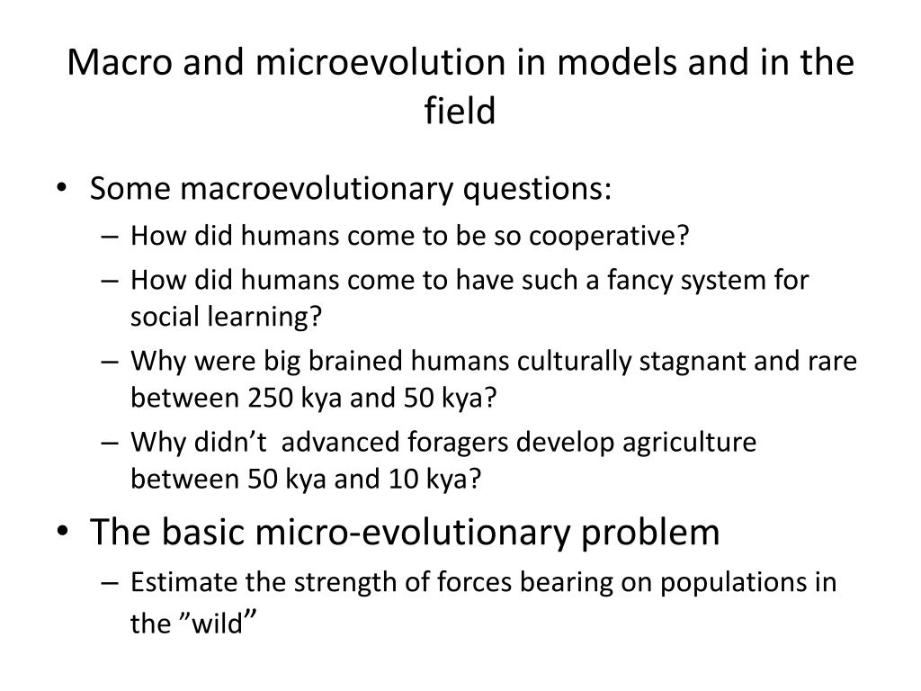 Macro and microevolution in models and in the field • Some macroevolutionary questions: • How did humans come to be so cooperative? • How did humans come to have such a fancy system for social learning? • Why were big brained humans culturally stagnant and rare between 250 kya and 50 kya? • Why didn’t advanced foragers develop agriculture between 50 kya and 10 kya? • The basic micro-evolutionary problem • Estimate the strength of forces bearing on populations in the ”wild”