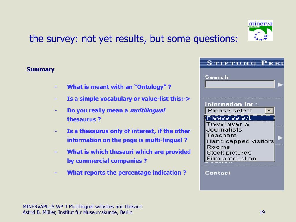 the survey: not yet results, but some questions: Summary • What is meant with an “Ontology” ? • Is a simple vocabulary or value-list this:-> • Do you really mean a multilingual thesaurus ? • Is a thesaurus only of interest, if the other information on the page is multi-lingual ? • What is which thesauri which are provided by commercial companies ? • What reports the percentage indication ? MINERVAPLUS WP 3 Multilingual websites and thesauri Astrid B. Müller, Institut für Museumskunde, Berlin19
