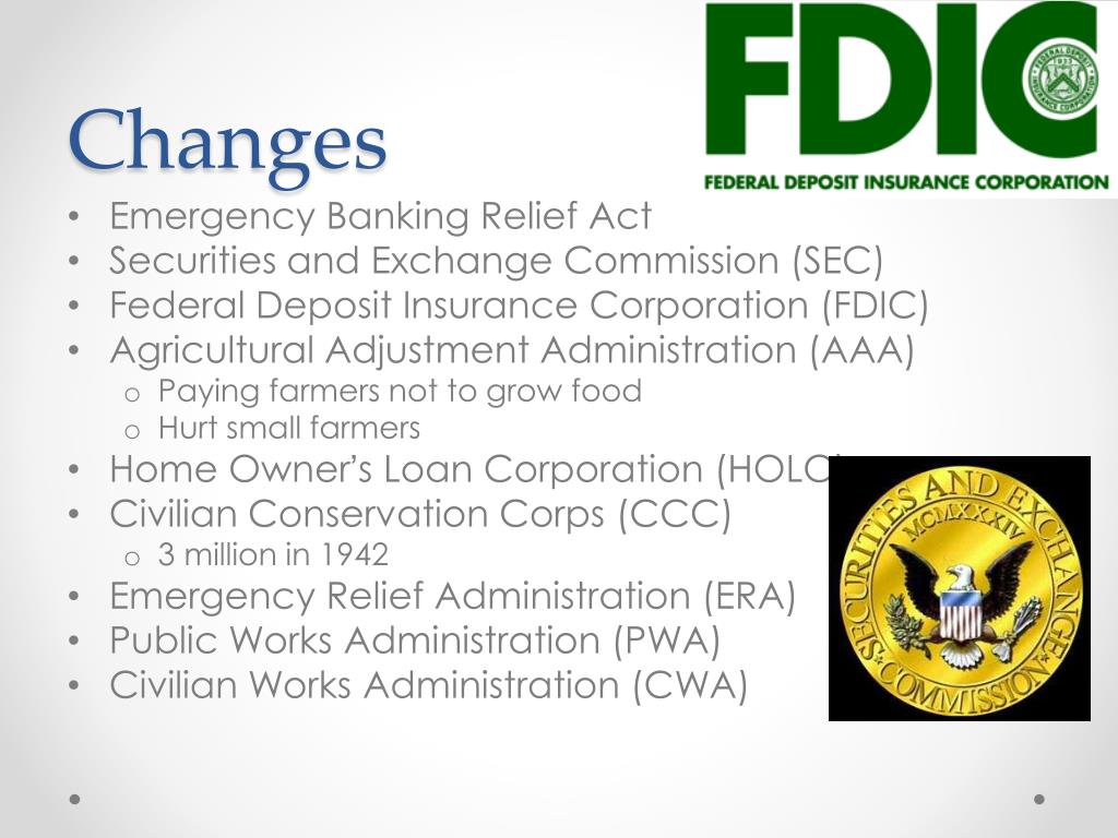 Changes • Emergency Banking Relief Act • Securities and Exchange Commission (SEC) • Federal Deposit Insurance Corporation (FDIC) • Agricultural Adjustment Administration (AAA) • Paying farmers not to grow food • Hurt small farmers • Home Owner’s Loan Corporation (HOLC) • Civilian Conservation Corps (CCC) • 3 million in 1942 • Emergency Relief Administration (ERA) • Public Works Administration (PWA) • Civilian Works Administration (CWA)