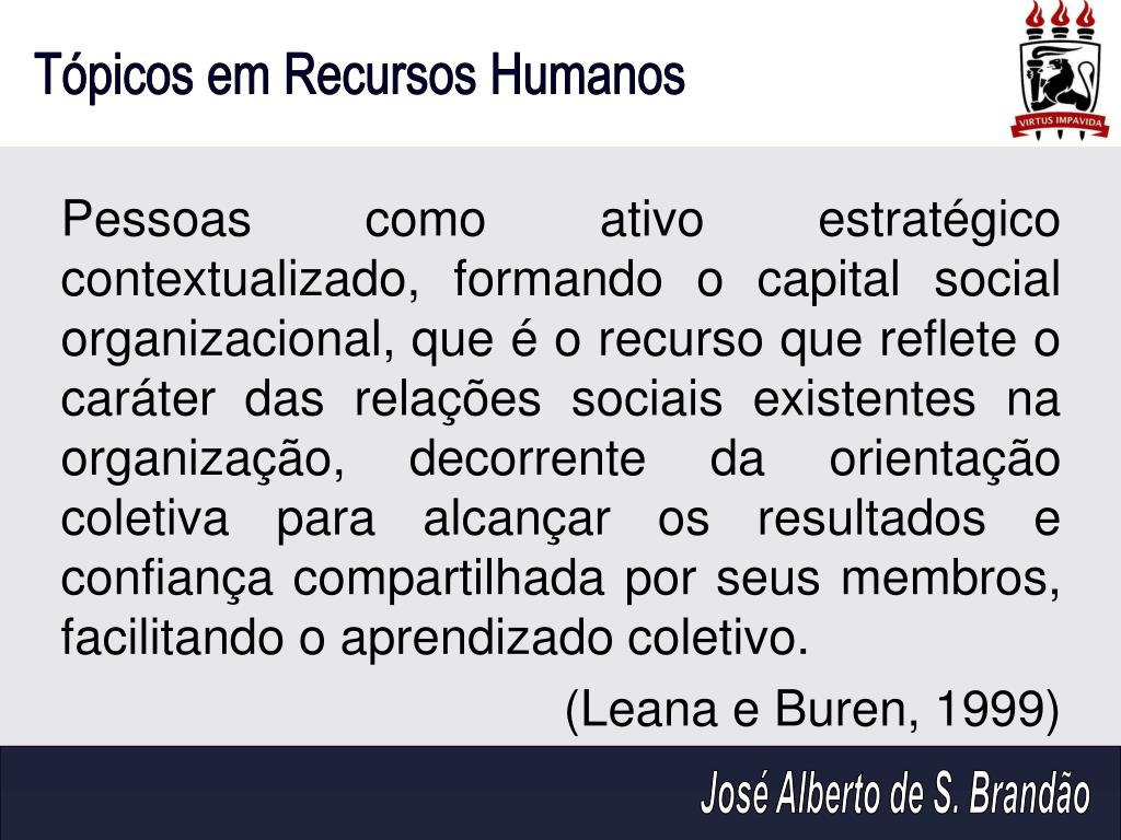 Pessoas como ativo estratégico contextualizado, formando o capital social organizacional, que é o recurso que reflete o caráter das relações sociais existentes na organização, decorrente da orientação coletiva para alcançar os resultados e confiança compartilhada por seus membros, facilitando o aprendizado coletivo. (Leana e Buren, 1999)
